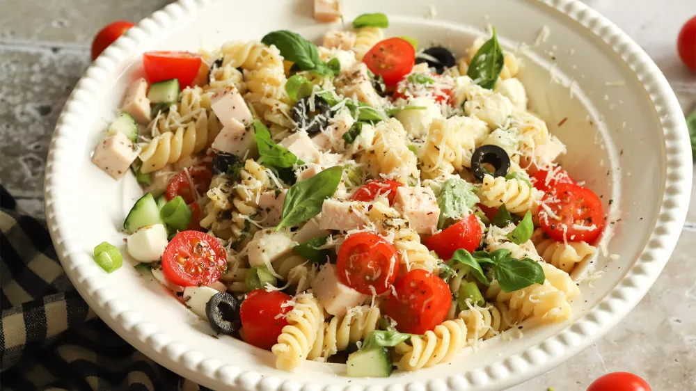 ZELENJAVA – Ta italijansko navdihnjena solata vsebuje tudi olive. Uporabite črne ali zelene. Za svežino je v solati še kumara in pa češnjevi paradižniki. V solato lepo sodijo tudi vloženi sladki čiliji, ki niso pekoči, dodajo pa zanimiv okus. V solati pa ne sme manjkati niti čebula, uporabite mlado čebulico, lahko bi pa tudi malo sesekljane rdeče čebule ali šalotke.