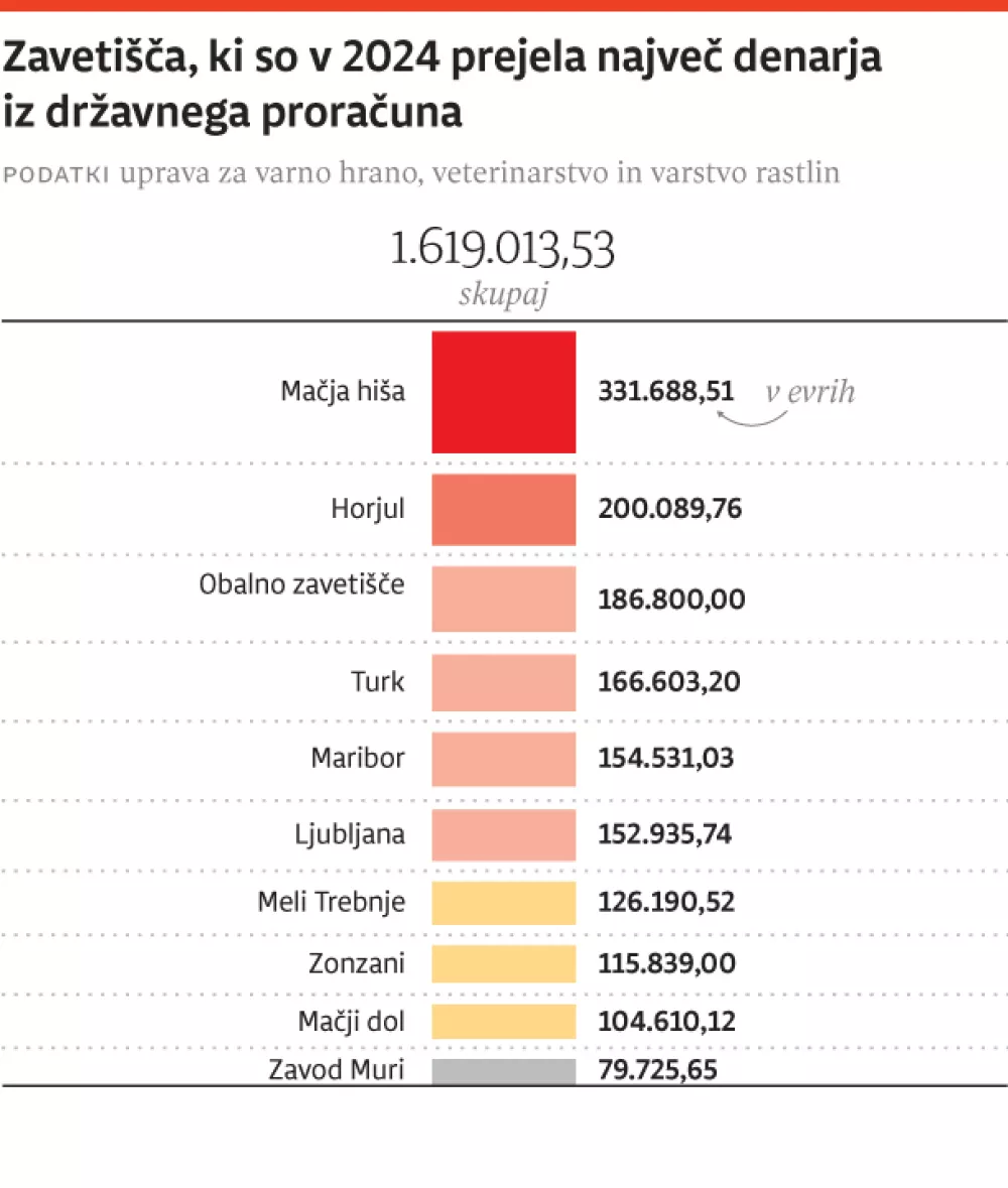 Uprava za varno hrano je lani za dolgotrajno oskrbo zapuščenih živali, torej tistih, ki so bile v zavetišču dlje kot 120 dni, namenila nekaj manj kot 1,8 milijona evrov (leta 2023 dobrih 1,5 milijona, leta 2022 pa blizu 329.000 evrov). Podatka, koliko takšnih živali so financirali v letu 2024, na upravi nimajo. So pa glavnino denarja za dolgotrajno oskrbo, dobrih 1,6 milijona evrov, izplačali desetim zavetiščem.