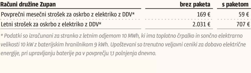 Družina Zupan predstavlja tipično slovensko gospodinjstvo, ki živi v hiši. Letno porabijo 10.000 kWh električne energije. Njihova sončna elektrarna ima moč 10 kW, poleg tega pa uporabljajo hranilnik z zmogljivostjo 9 kWh. Pred samooskrbo so za elektriko plačevali 2.031 € na leto, zdaj pa le še 707 €. S tem letno prihranijo 1.324 €, kar pomeni 65 % nižji strošek za elektriko.