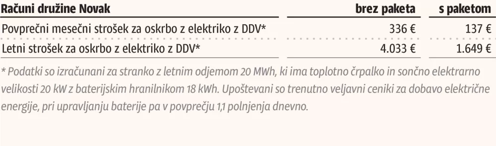 Družina Novak ima na domači kmetiji tudi dopolnilno dejavnost, zaradi česar je njihova letna poraba elektrike večja in znaša 20.000 kWh. Pred vključitvijo v Pametno samooskrbo so za elektriko plačevali 4.033 €, zdaj pa njihov letni strošek znaša 1649 €. To pomeni 2.384 € prihranka oziroma 59 % nižji letni strošek za elektriko.