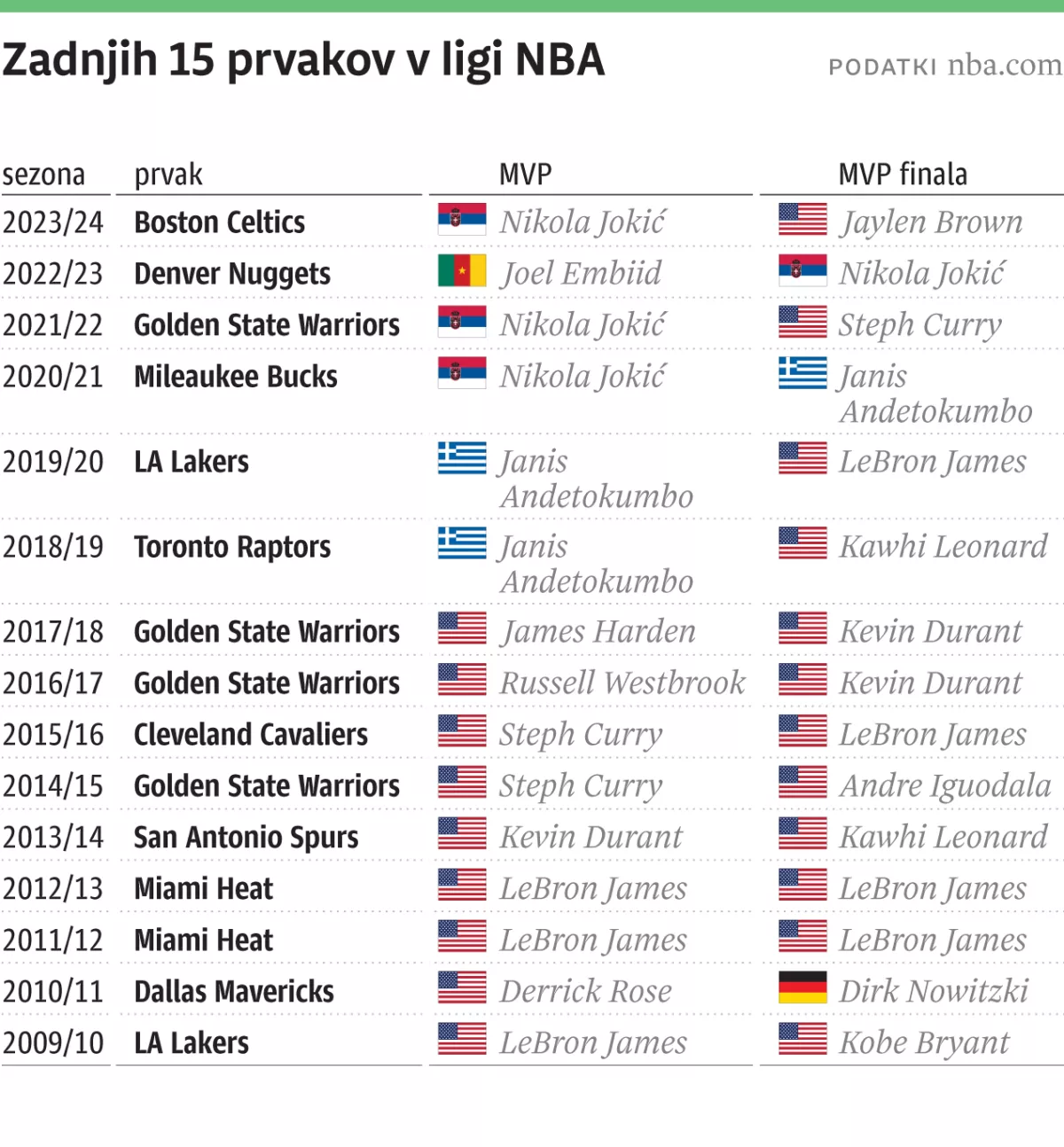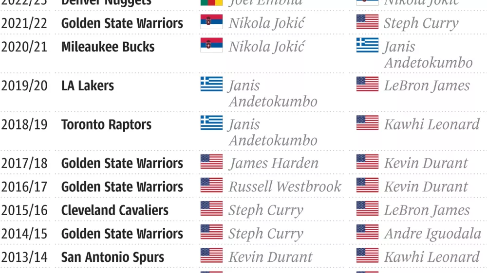 Glavna nevarnost bo za Dallas prežala z vzhodne konference. Aktualni prvaki iz Bostona poleti niso menjali prav ničesar in so odločeni, da ponovijo uspeh iz lanske sezone. Edina tegoba je poškodba Kristapsa Porzingisa, ki je konec junija odšel na operacijo stopala in naj bi se po napovedih na parkete vrnil decembra. »Vedeli smo, da bomo slej kot prej osvojili naslov prvaka. A zdaj se poraja vprašanje, kako pomembni želimo biti v zgodovini lige NBA? Obdobje, ko lahko osvajamo šampionske prstane, ne bo večno, zato smo resnično lačni, da si jih na prste nataknemo čim več,« je jasen Jayson Tatum. Največji konkurenti Bostonu na vzhodu bodo New York, ki je ob Townsu ekipi dodal še Mikala Bridgesa in Camerona Payna, Philadelphia, ki je medse zvabila Paula Georga, in Milwaukee, ki moštva pretirano ni spreminjal. Nikoli pa ni za odpisati tudi Miami.