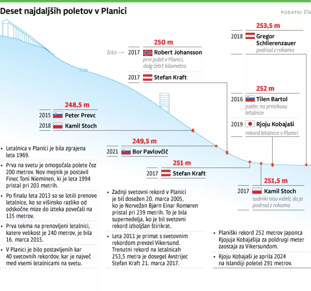 Letalnica v Planici je letos pripravljena odlično. Organizatorji zatrjujejo, da je realna možnost tudi svetovnega rekorda, ki ga trenutno s 253,5 metri drži Stefan Kraft iz Vikersunda. Da je letalnica bratov Gorišek v odličnem stanju, so v sredo na uradnem preizkusu letalnice potrdili tudi predskakalci. Z razliko s tradicijo preteklih let, ko so preizkusni letalci na svoj prvi skok na vrhu naleta morali čakati tudi uro ali več, se je tokrat Lojze Petek iz zaletne rampe spustil v točno določenem času, ob 10. uri. »Malce me je bilo strah, a sem letos na željo Roka Tarmana prevzel številko ena, saj si je moj prijatelj želel poleteti osebni rekord, kar za voljo slabše smučine s številko ena ni mogoče. Vseeno je letalnica pripravljena odlično,« je po prvem skoku na letalnici letos povedal Lojze Petek, ki je tudi fizioterapevt slovenske reprezentance A.